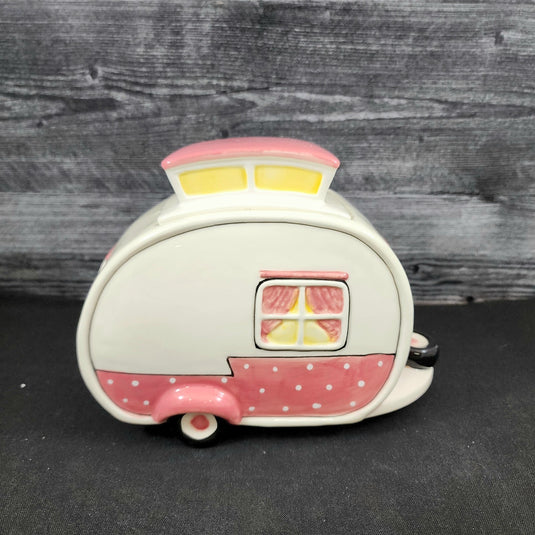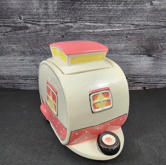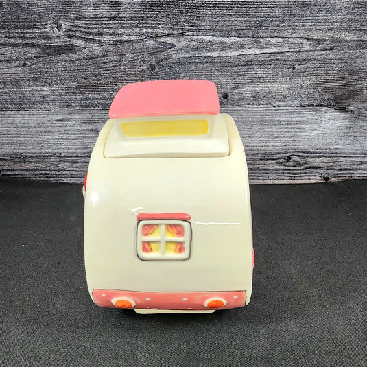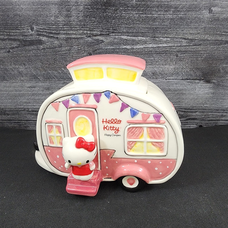 Hello Kitty Retro Camper Cookie Snack Jar Pink Ceramic Blue Sky Embossed Decor